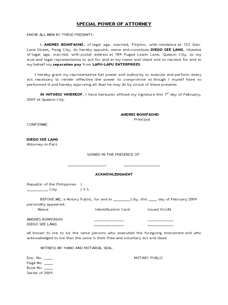 Special Power Of Attorney Separation Pay Power Of Attorney Notary Public